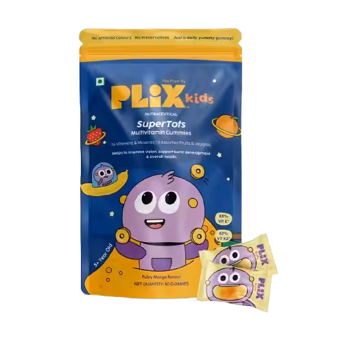 1. Plix Kids⢠SuperTots Multivitamin Gummies are tasty & nutritious gummies for kids designed to support overall growth & development. These multivitamin gummies for kids are enriched with essential vitamins & a fruit & vegetable blend to promote strong bones, better vision, energy, & immunity. Crafted as delicious vitamin gummies for kids, they are easy to consume & ideal for daily nutrition.